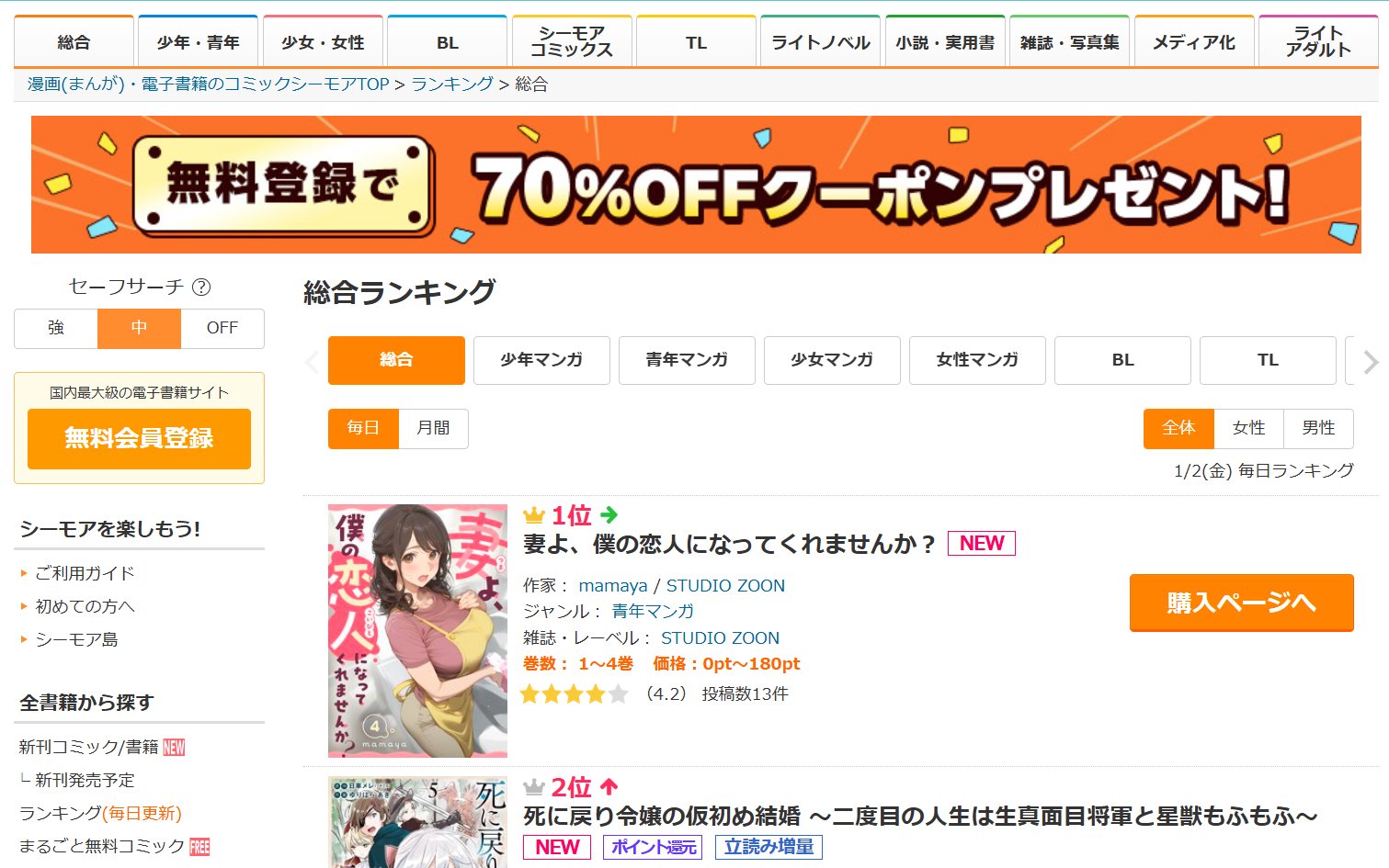 AI漫画家mamayaさんの「妻よ、僕の恋人になってくれませんか?」が、コミックシーモア総合ランキング(日間)1位になっていました。ちょっとびっくり😳… pic.twitter.com/ePRWJ6BXIx