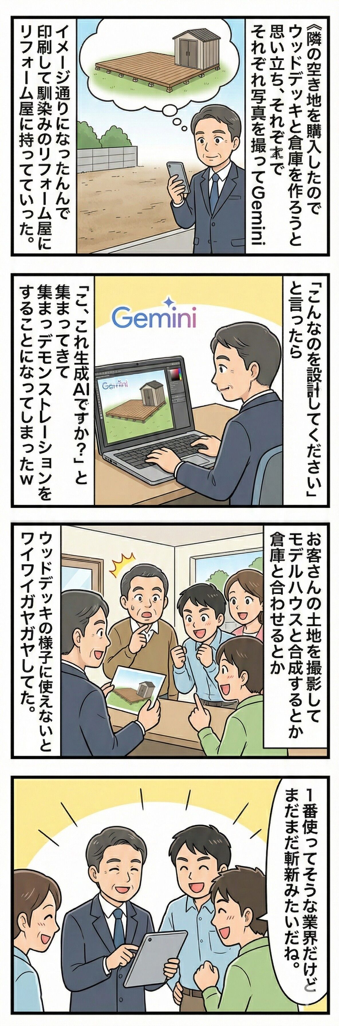 隣の空き地を購入したのでウッドデッキと倉庫を作ろうと思い立ち、それぞれ写真を撮ってGeminiで合成してから細々と指示したらイメージ通りになったんで印刷して馴染みのリフォーム屋に持っていった。