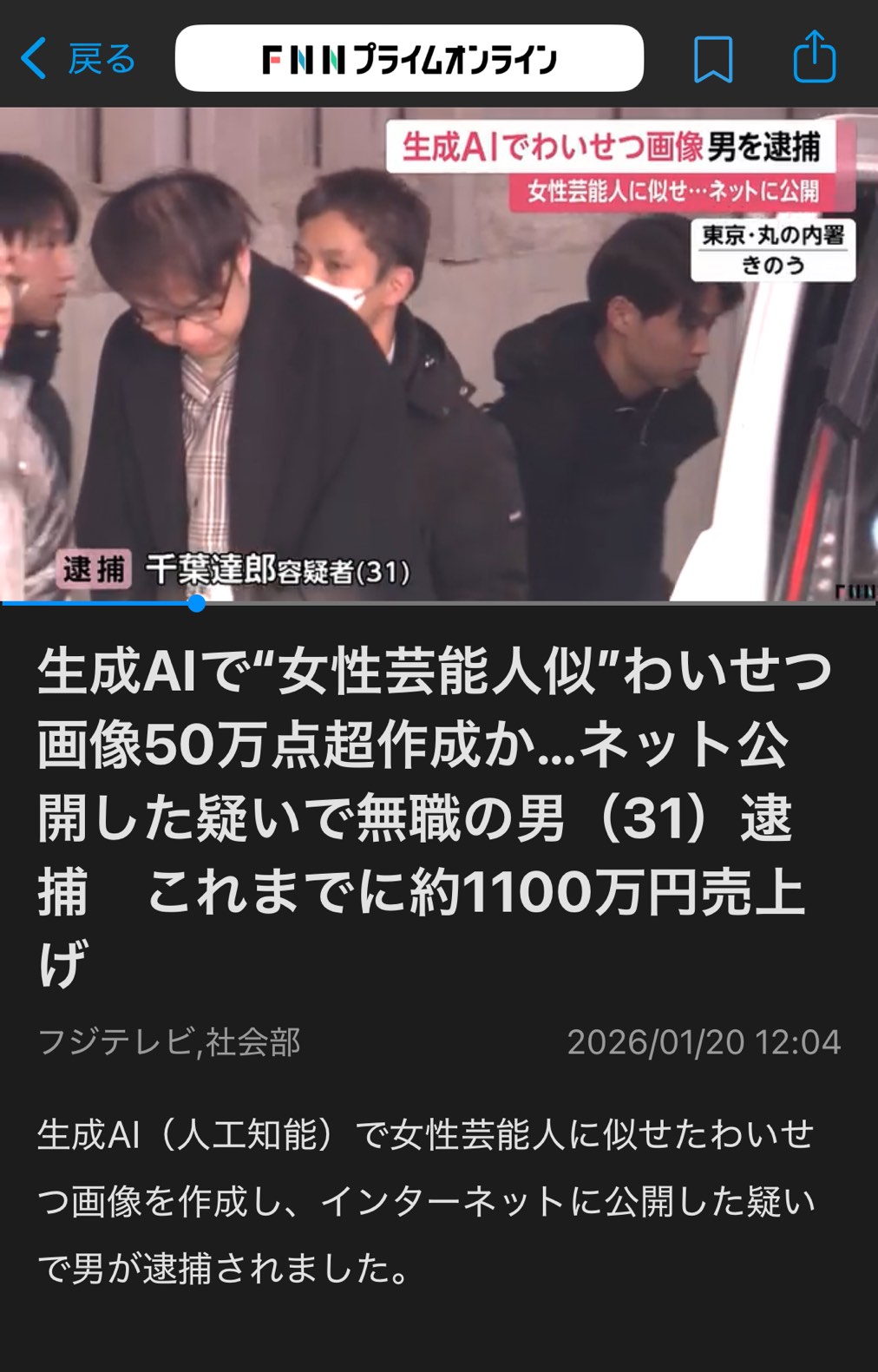 ・警視庁は 生成AIで女性芸能人に似せたわいせつ画像を作成し公開したとして 札幌市の31歳男性を逮捕した。