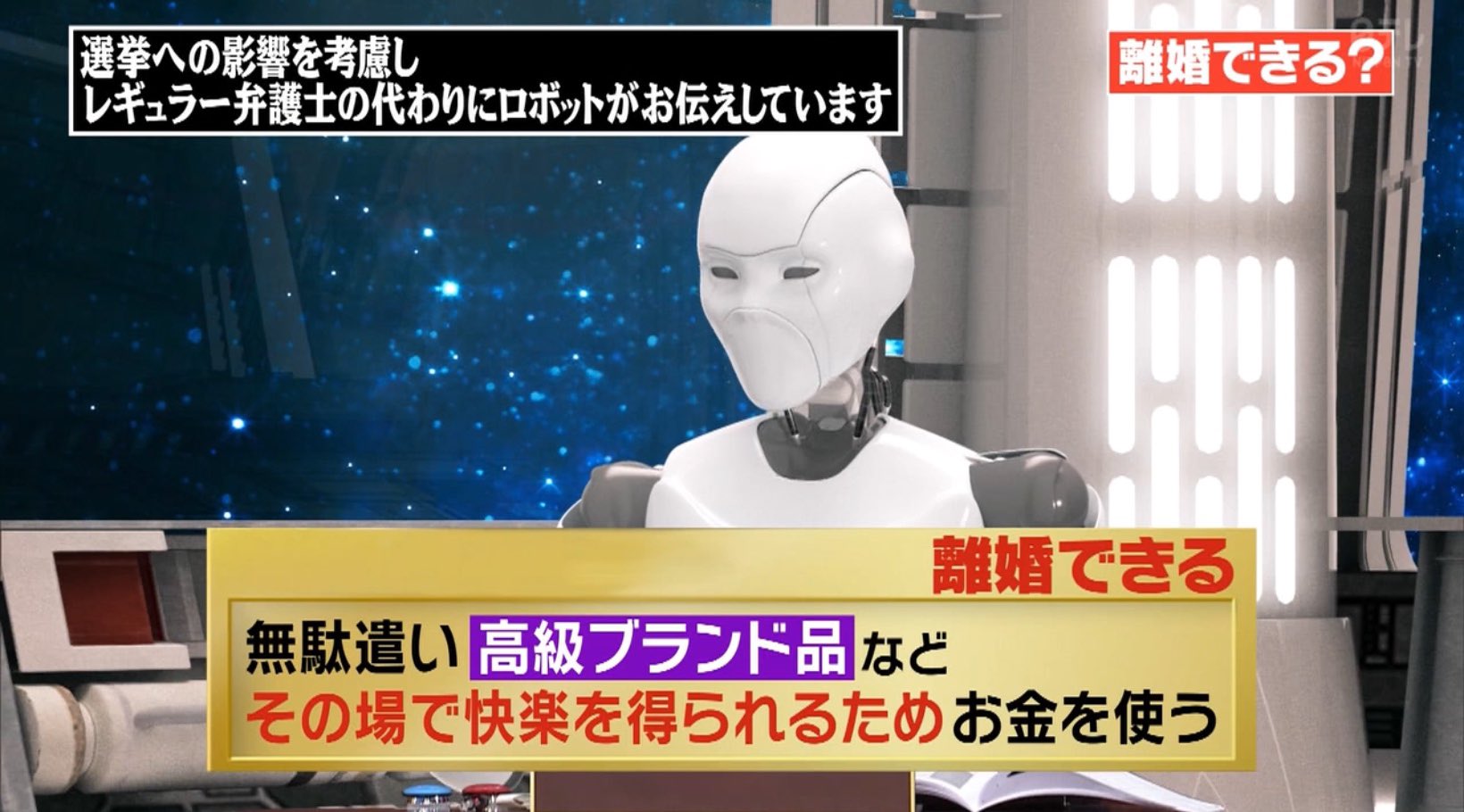 ・番組側は 選挙への影響を考慮し レギュラー弁護士の代役としてロボットを使用したと説明。