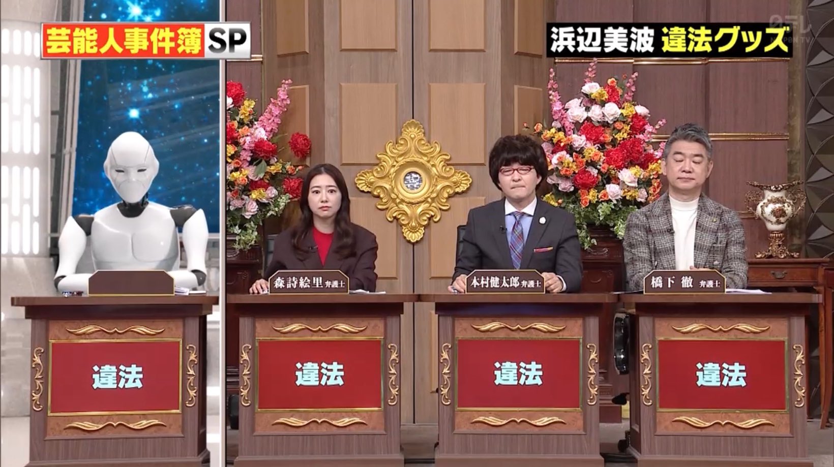 弁護士軍団には、森詩絵里、本村健太郎、橋下徹が登場。横並びでひとりだけ「ロボット」となっていたが、テロップで「選挙への影響を考慮し、レギュラー弁護士の代わりにロボットがお伝えしています」と伝えられた。