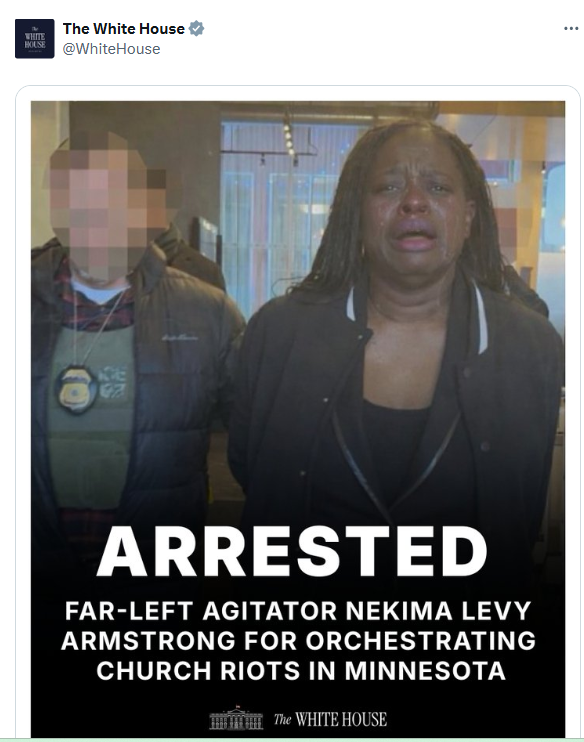 女性はネキマ・レヴィ・アームストロングで、加工後の画像では肌の色もより暗く見える。アームストロングは、日曜日にミネソタ州セントポールで行われ、教会の礼拝を妨害したデモに関連して逮捕された3人のうちの1人だった。デモ参加者は、牧師の1人であるデビッド・イースターウッドが、セントポール移民・関税執行局(ICE)の現地責任者を務めていると主張していた。ボンディは木曜朝、SNSで逮捕を発表した。