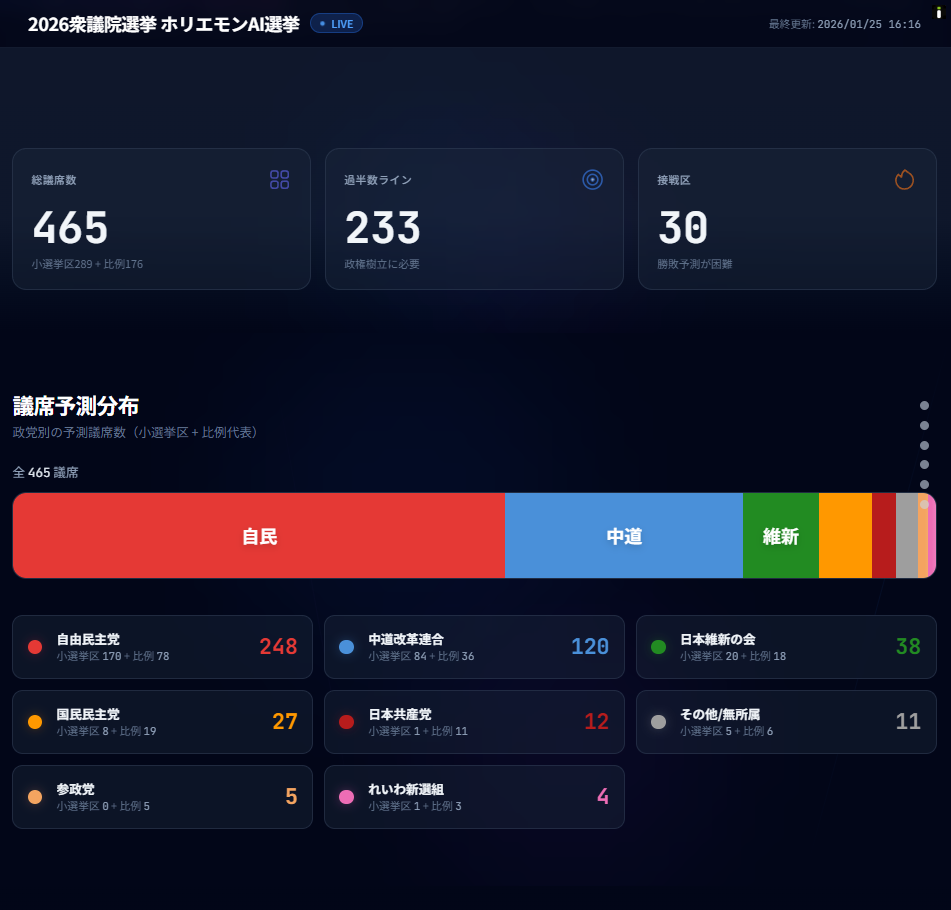 ・最新のAI選挙予測では自由民主党が議席を大きく伸ばし、単独で過半数に届く可能性が示された。