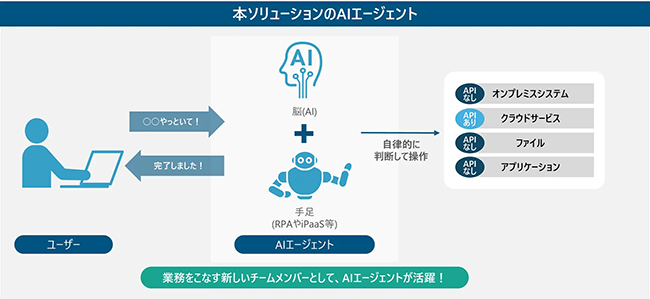 このソリューションはAIエージェントがRPAロボットを「手足」として制御し、クラウドサービスや社内システムを横断して業務を自動化するものとなる。