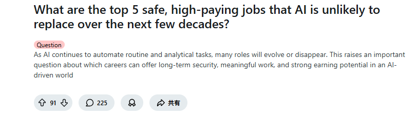 翻訳:今後数十年の間にAIに置き換えられる可能性が低く、安全で高収入な職業トップ5は何か?