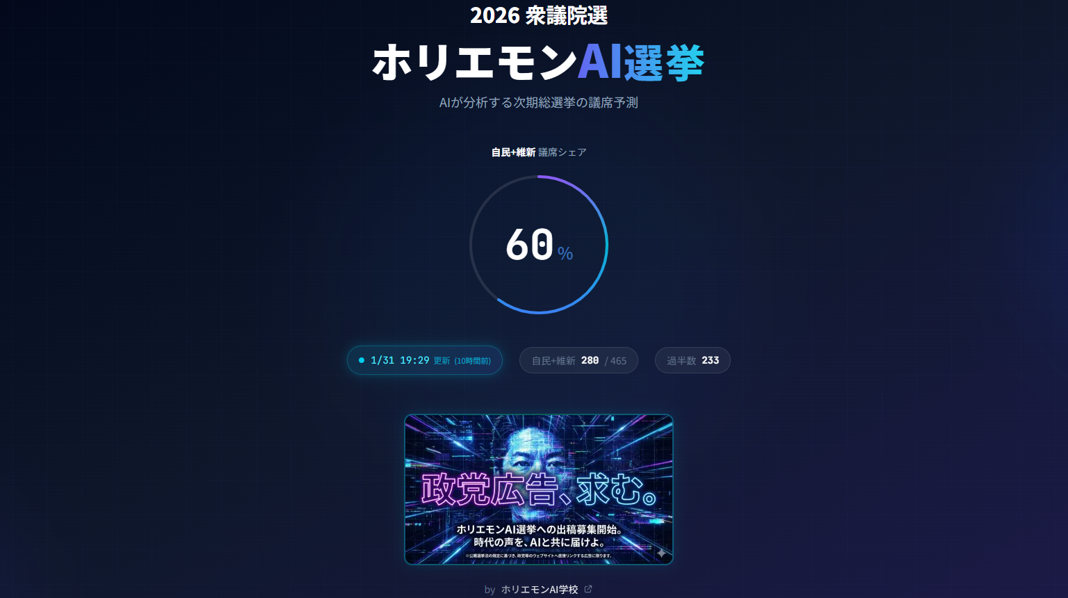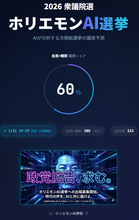 ホリエモンAI衆院選議席予測。自民245、中道112、維新35、国民22、参政10、共産9、減ゆ6、チみ4、保守2、れ0