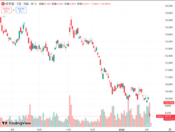 ・Switch2好調も株価急落。 新型機が史上最速の1737万台を売り上げ過去最高収益を記録するも、決算後に株価は12%超下落、半年で3割安の水準となりました。