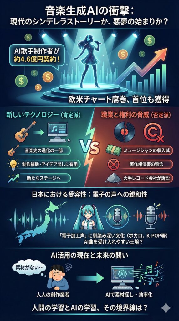 欧米ではAI生成楽曲がチャートを席巻し、AI歌手の制作者が巨額契約を結ぶなどビジネス化が加速している。一方で、職業的脅威や著作権侵害を巡り大手レーベルが開発企業へ訴訟を起こすなど、業界内では新技術としての歓迎と強い反発で賛否が割れている。