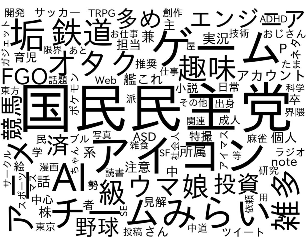 一方、応援派では「国民民主党」「チームみらい」の支持者を示唆する単語と、「ウマ娘」「鉄道」などの趣味を示す単語が多く含まれており、どちらかといえばX利用者の一般的なプロフィールが多いことが分かります。