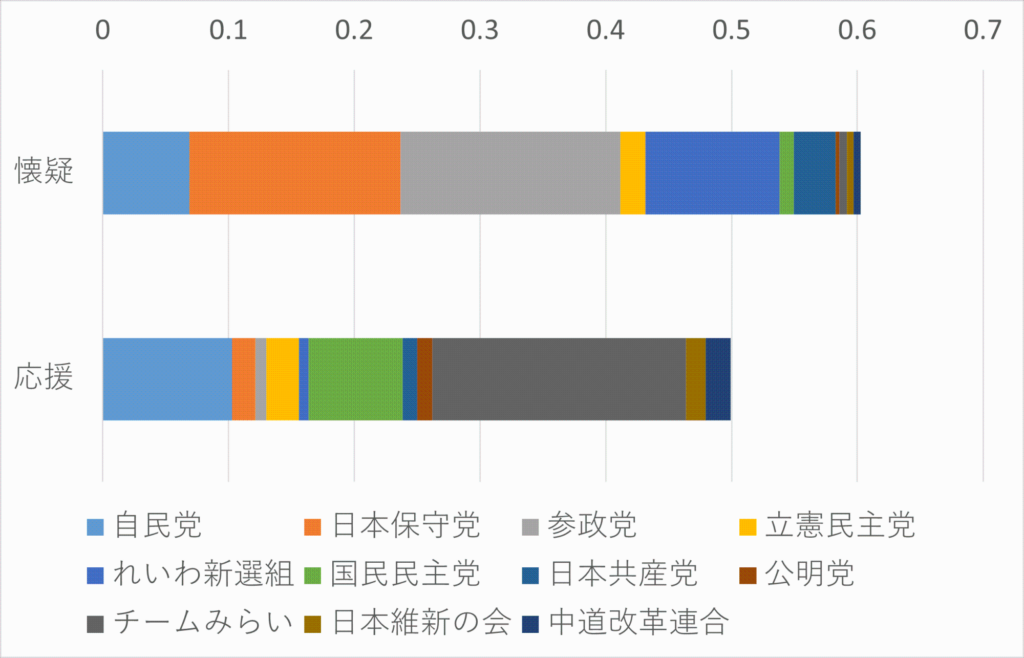 この結果から、懐疑派のプロフィールには「参政党」「保守党」「れいわ新選組」の支持者である可能性を示唆する単語が多く含まれていることが分かりました。「日本」は保守党フォロワーが良く使う単語で、「反対」はれいわ新選組や参政党のフォロワーが良く使う単語でもあります。