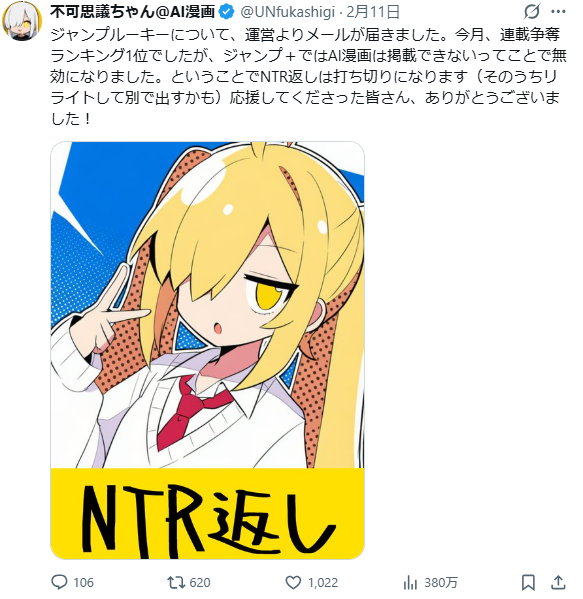 しかし、作者がX上で共有したところによると「ジャンプルーキーについて、運営よりメールが届きました。今月、連載争奪ランキング1位でしたが、ジャンプ+ではAI漫画は掲載できないってことで無効になりました。ということでNTR返しは打ち切りになります(そのうちリライトして別で出すかも)」と経緯を明かした。