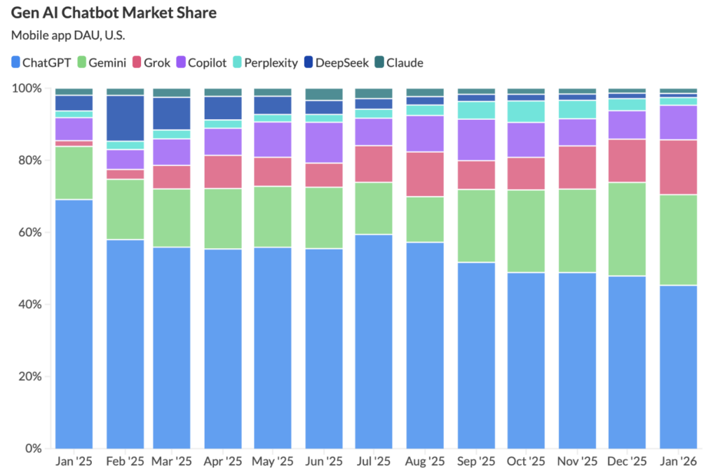 まさに「絶対王者の陥落」だな。代わってGeminiが29%まで伸ばし、Grokも17%と急浮上している。ユーザーが用途に合わせてAIを使い分ける分散化が数字にハッキリ出てるぜ