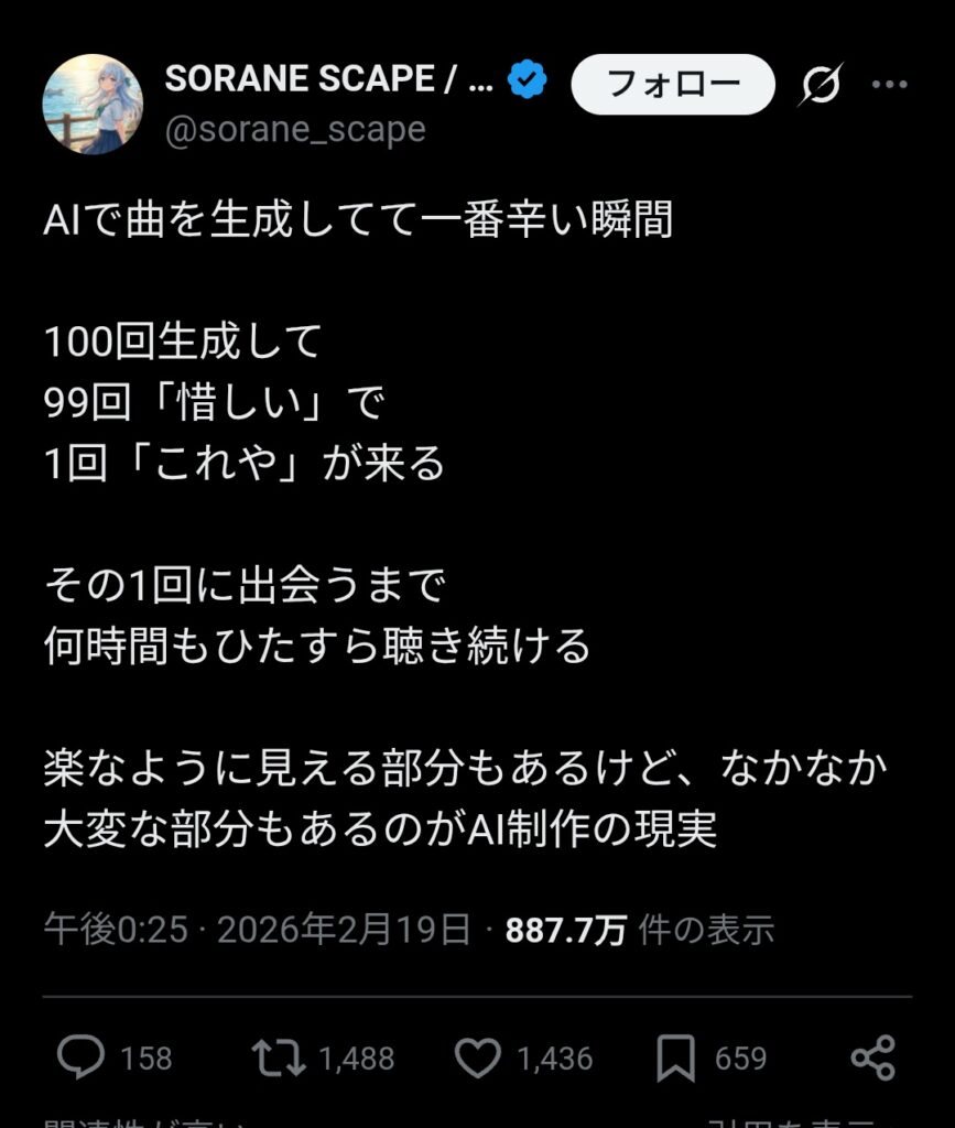 作品に仕上げるのが私の仕事です— SORANE SCAPE / AI音楽 (@sorane_scape) February 20, 2026