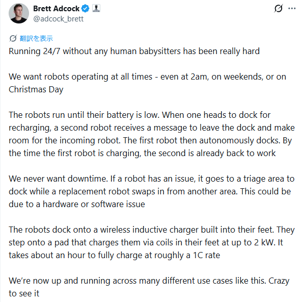 翻訳:雨の日でも晴れの日でも、機械は眠らない。Figure AIのロボットは、人の手を介さず24時間365日、自律稼働している。