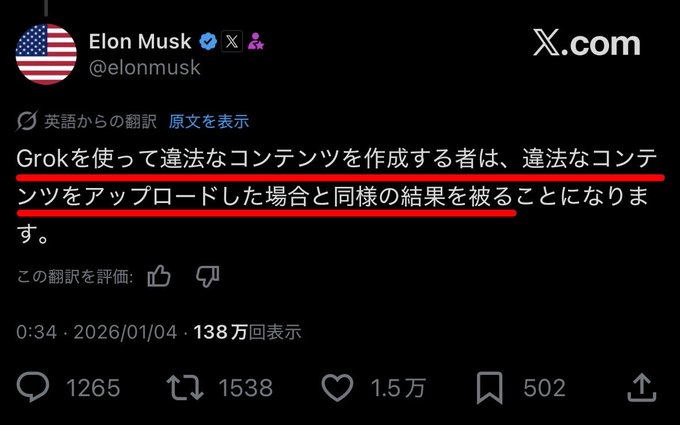 「Grokを使って違法なコンテンツを作成する者は、違法なコンテンツをアップロードした場合と同様の結果を被ることになる」