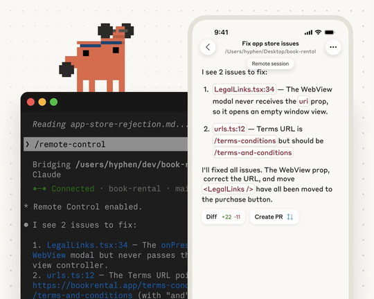 ターミナルにセッションURLが表示されるので、他のデバイスからそのURLを開けばリモート接続が完了する。「claude.ai/code」のセッション一覧から選択したり、スマートフォンに「Claude」アプリ(iOS/Android)がインストールされているならば、QRコードを介して接続することも可能。