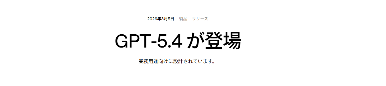 ・2026年3月5日リリース: OpenAIが専門業務に特化した最新モデル「GPT-5.4」をChatGPTやAPI等で公開。