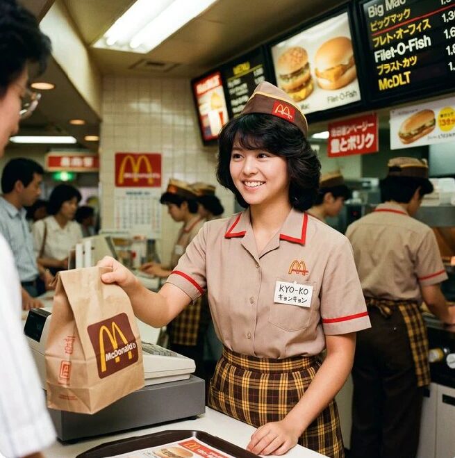 という文言とともに投稿されたのは、昭和の雰囲気が漂うマクドナルド風の店内で、当時の制服に身を包んだ小泉今日子風の店員姿だ。