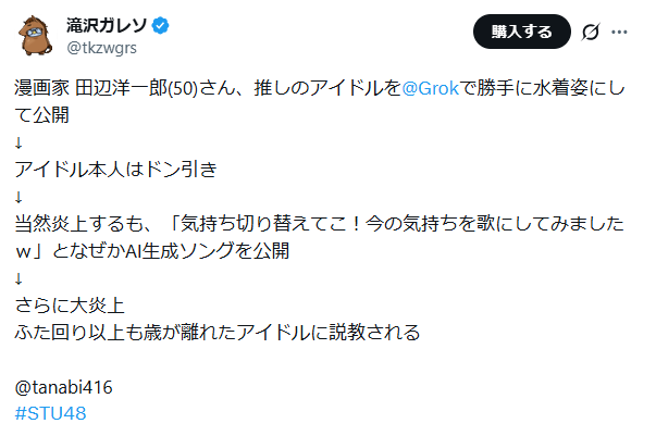 漫画家 田辺洋一郎(50)さん、推しのアイドルを@Grokで勝手に水着姿にして公開